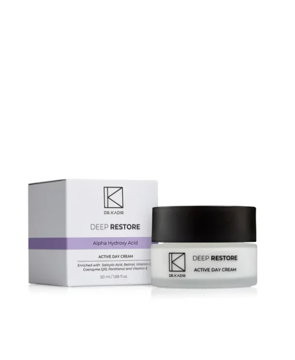 Dr. Kadir Deep Restore Active Day Cream - це преміальний денний крем із комплексом активних кислот, антиоксидантів та SPF‑захистом, створений для підтримки відновлюючого догляду протягом дня. Крем працює як місток між нічним відновленням та денним захистом, забезпечуючи глибоке зволоження, пом’якшення та підтримку пружності шкіри, а також протидію віковим змінам. Завдяки поєднанню альфа‑ та бета‑гідроксикислот, вітамінів С, Е, ретинолу та коензиму Q10, крем сприяє вирівнюванню тону, зменшенню видимих зморшок і підтримці еластичності шкіри під впливом стресів навколишнього середовища та УФ‑випромінювання.