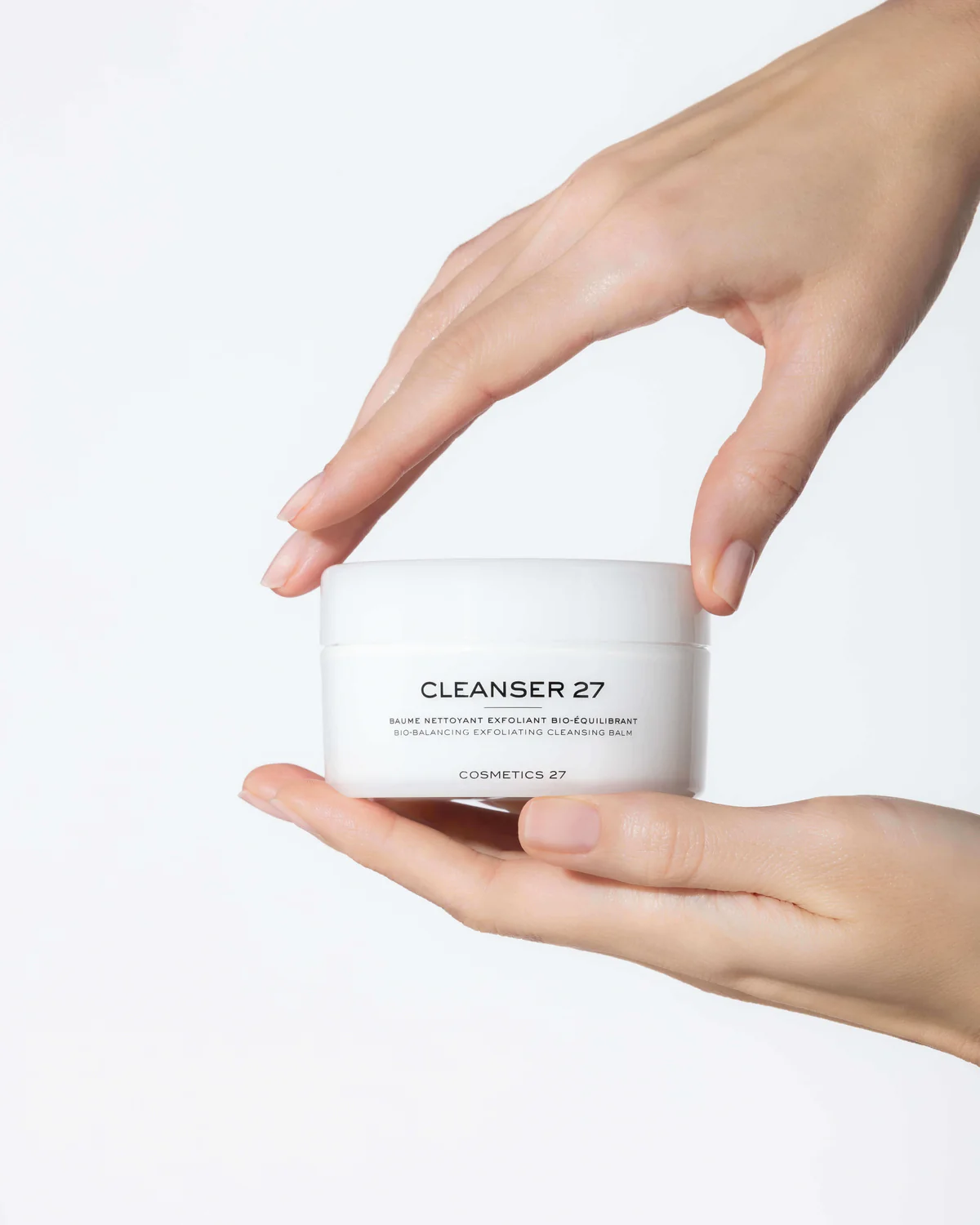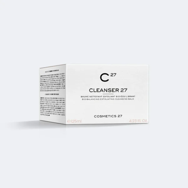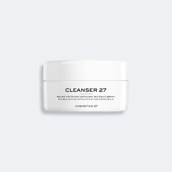 Cosmetics 27 Cleanser 27 - це багатофункціональний біобальзам-очищувач, що поєднує трьохетапну дію: діє як засіб для зняття макіяжу, глибоке очищення та легка ексфоліація. Його кремоподібна формула перетворюється в олію при контакті зі шкірою, ефективно розчиняючи забруднення й жир, а при емульгуванні з водою м’яко чистить шкіру, залишаючи її м’якою, зволоженою, розсіяно сяючою та збалансованою.