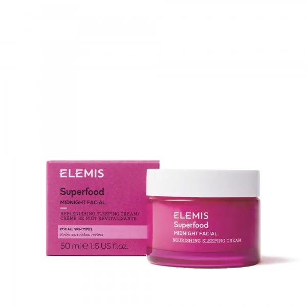 Elemis Superfood Midnight Facial - нічний крем із пребіотиками, спрямований на відновлення та інтенсивне живлення сухої та зневодненої шкіри під час сну. Формула поєднує джерела антиоксидантів, жирних кислот і пребіотичних компонентів, що працюють у синергії для підтримки мікробіома шкіри, її барʼєрної функції та оптимального рівня вологи. Активи, включно з екстрактом каму‑каму (багатий вітаміном C), маслом какао і екстрактом бананових квіток, сприяють зволоженню шкіри, підсиленню її пружності та рівномірності тону. Крем має ніжну гель‑кремову текстуру, яка працює протягом ночі, забезпечуючи комфортну реконструкцію гідроліпідного барʼєру та зменшення ознак втомленого вигляду шкіри до ранку. Регулярне застосування допомагає посилити природну здатність шкіри утримувати вологу та підтримувати сяйливий, відпочилий вигляд після пробудження.