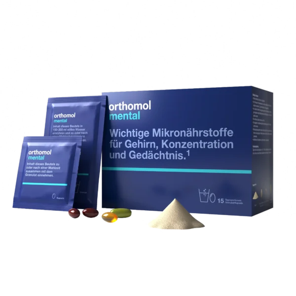 Orthomol Mental (Ортомол Ментал) – німецький вітамінно-мінеральний комплекс для активізації розумової діяльності, підвищення когнітивних здібностей та підтримки центральної нервової системи. Комплекс забезпечує мозок і нервову систему необхідними поживними речовинами для активної роботи, покращує нейронні зв’язки, пам’ять, увагу, концентрацію та здатність до навчання.