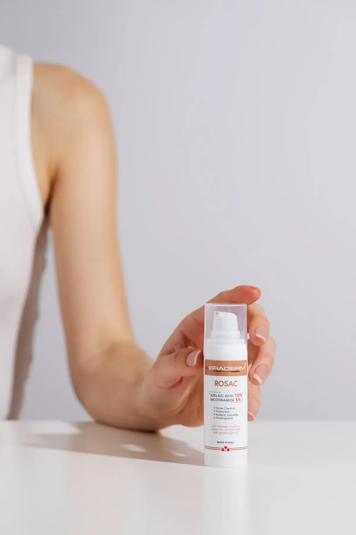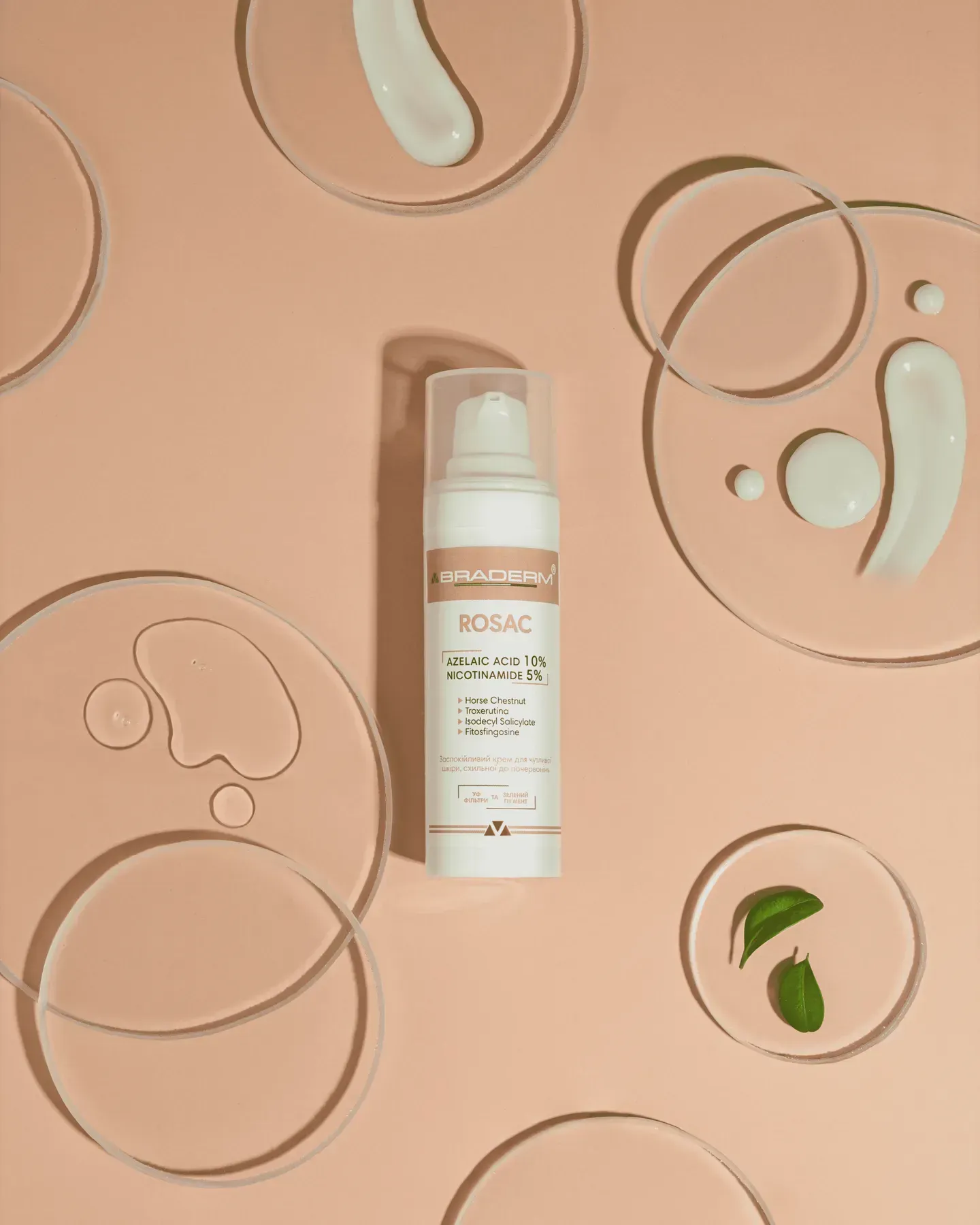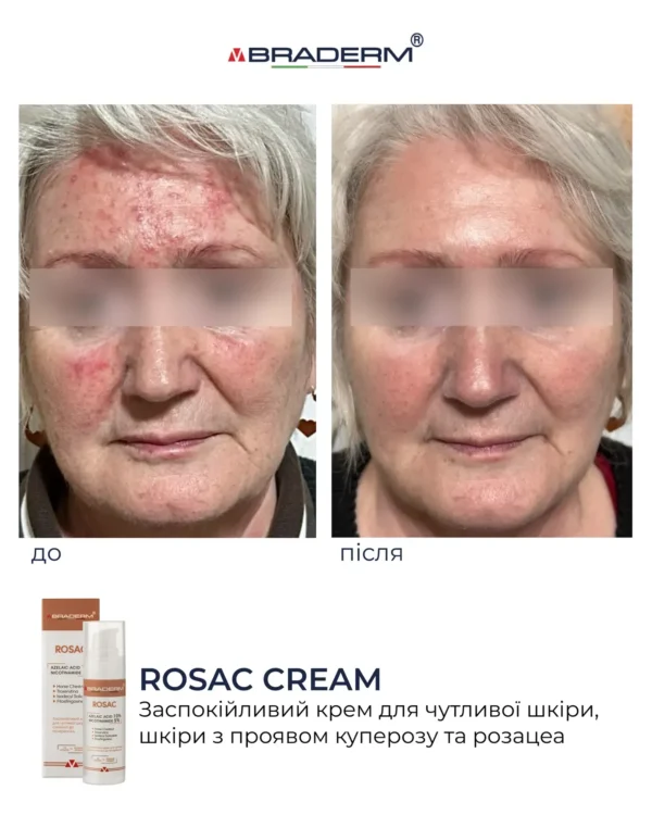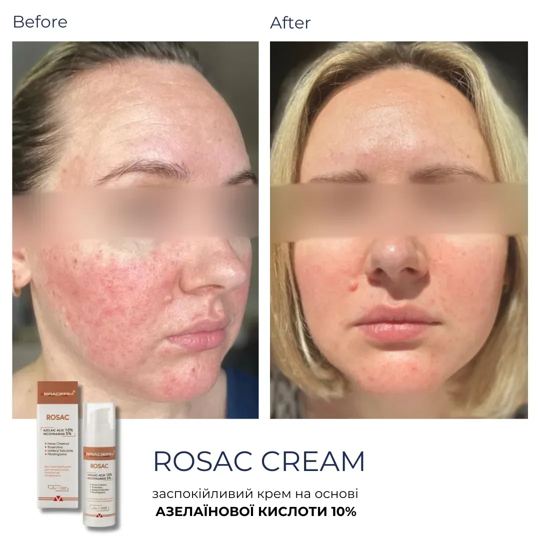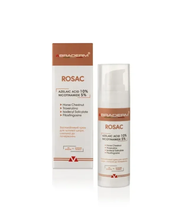 Braderm Rosac Cream - це заспокійливий крем, створений для щоденного догляду за чутливою, реактивною шкірою, схильною до почервоніння та дискомфорту. Формула поєднує азелаїнову кислоту та ніацинамід у збалансованій концентрації, що дозволяє працювати з нерівним тоном, проявами запалення та чутливістю без агресивного впливу.